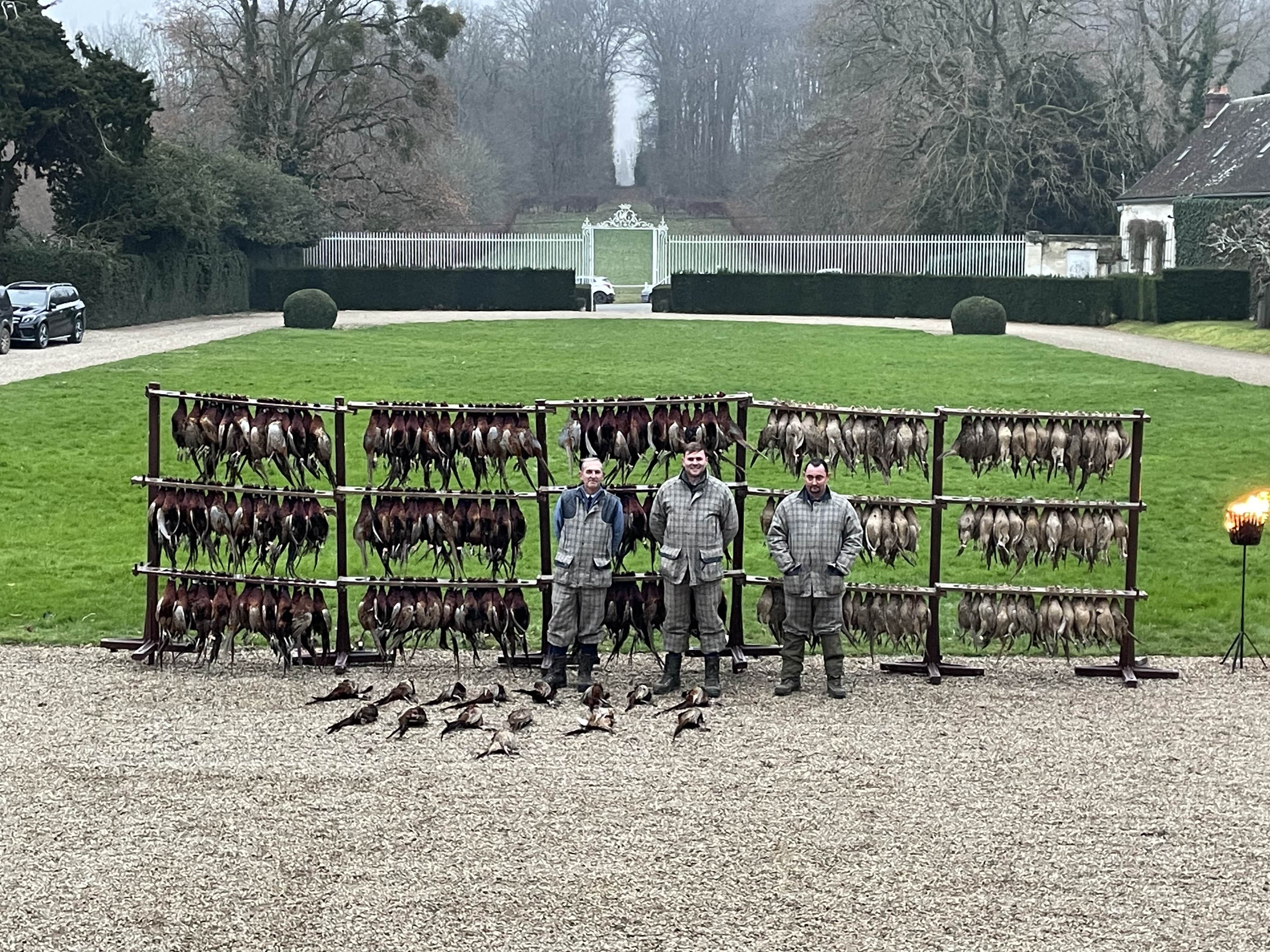 Une équipe de rabatteurs dévouée présente une quantité importante d’oiseaux à chaque battue, tandis qu’une équipe de ramasseurs équipée de chien attend patiemment pour récupérer le gibier.